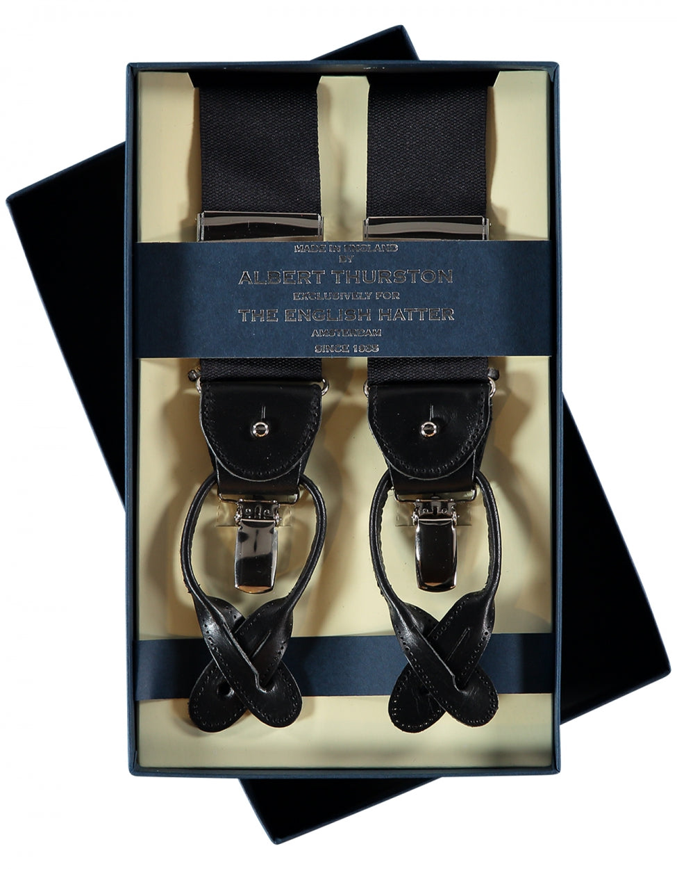 Het oer Britse Albert Thurston maakt al bijna 2 eeuwen (sinds 1820) de mooiste accessoires voor de man. Deze bretels kunt u op 2 manieren vastzetten aan de pantalon: De traditionele manier met de leertjes of modern met de clips. Voor gebruik met de leertjes heeft u knopen nodig in uw pantalon. Deze bretels zijn gemaakt van een luxe ribs band met een zijde glans, de achterzijde van de bretels is gemaakt van elastiek zodat u kunt bewegen. Deze bretels zijn 40mm breed.